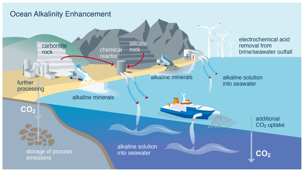 - Alkalinity enhancement: Adding substances like crushed olivine to seawater increases the ocean’s capacity to absorb CO₂.