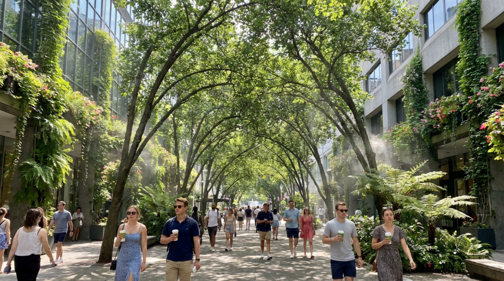 Cities are countering this with greenery that provides shade and evaporative cooling. The most intuitive way to cool a city is to stop treating it like a fortress of concrete and start treating it like an ecosystem. Nature has been doing air conditioning for billions of years through shading and evapotranspiration (the process where plants release water vapour).